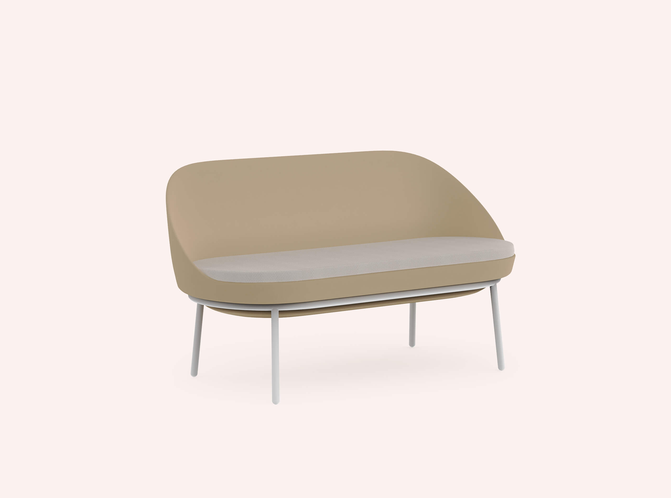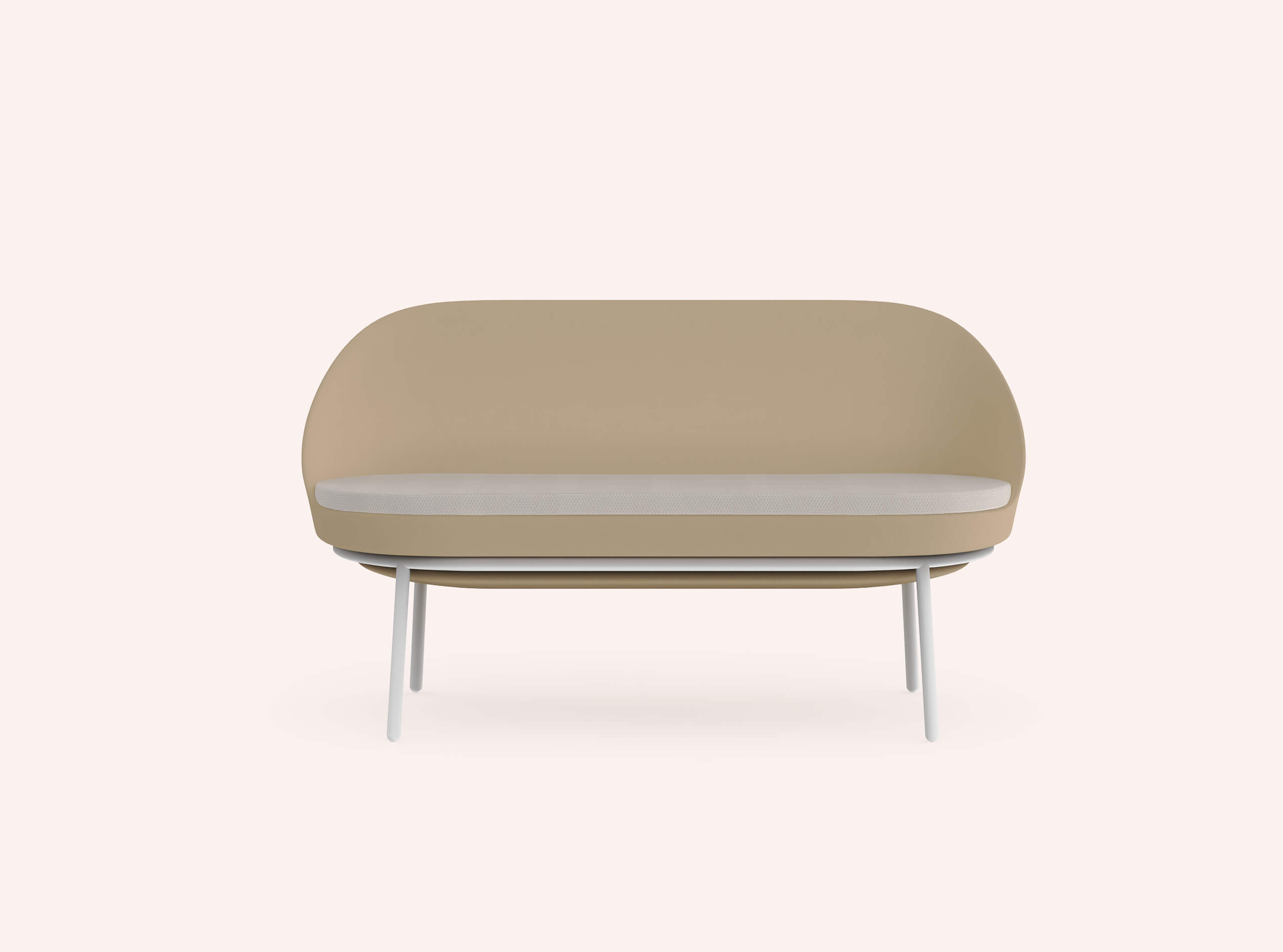 Material combination plays a central role in this approach. Upholstered elements introduce warmth and comfort, while a light metal structure frames the pieces and reduces the presence of polyethylene. This dialogue between materials helps create a more refined and balanced visual language.